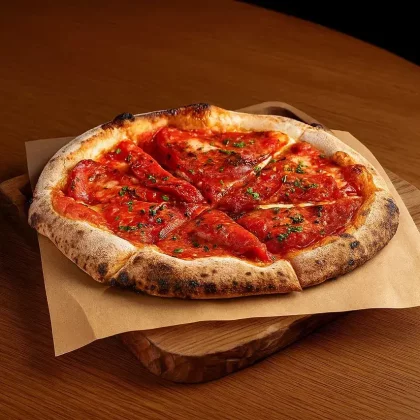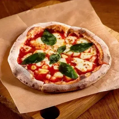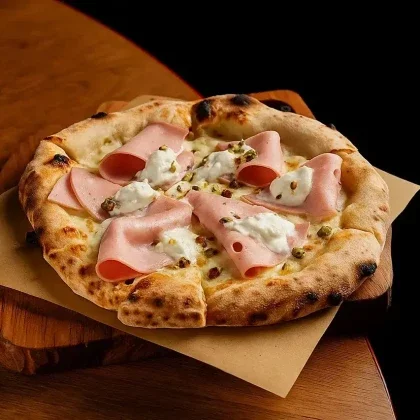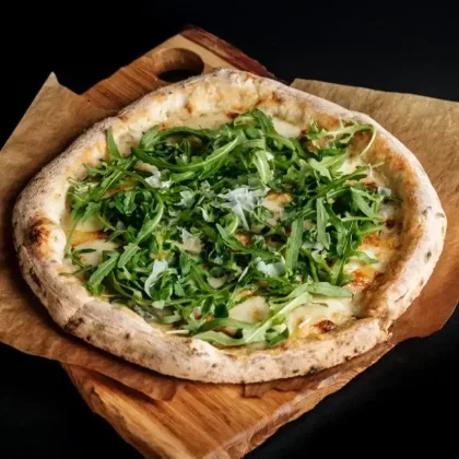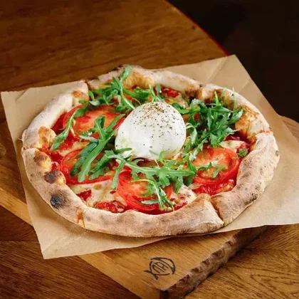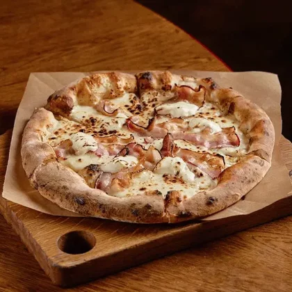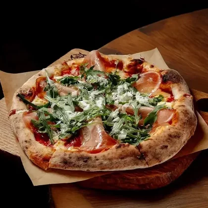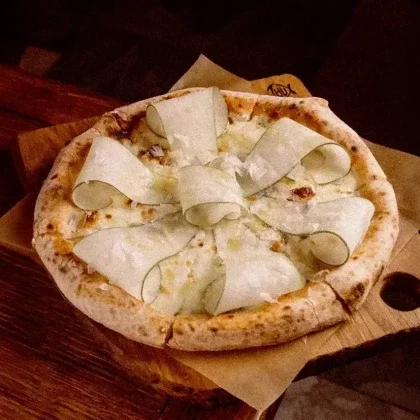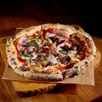 Тесто на пиццу (мука капуто, вода питьевая, соль, дрожжи, мука семола, мука пшеничная), сливки, сметана, моцарелла, белые грибы, Тамбовский окорок, петрушка, трюфельное масло (24 см).