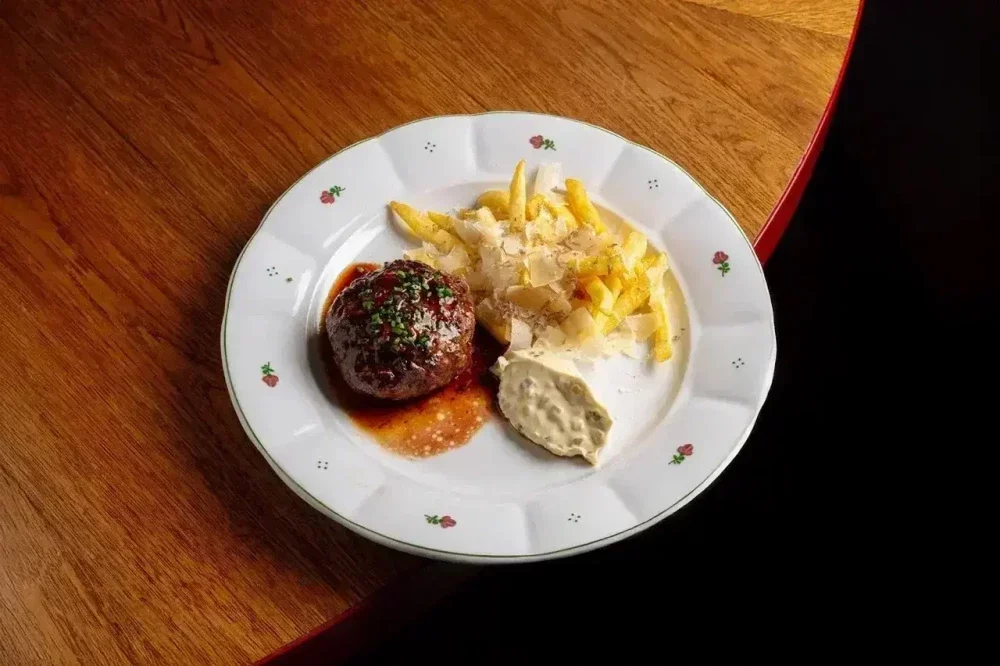 Бифштекс из говядины с луком, картофель фри, трюфельный демиглас, майонезно-горчичный соус с каперсами и маринованными огурцами, шичими, пармезан