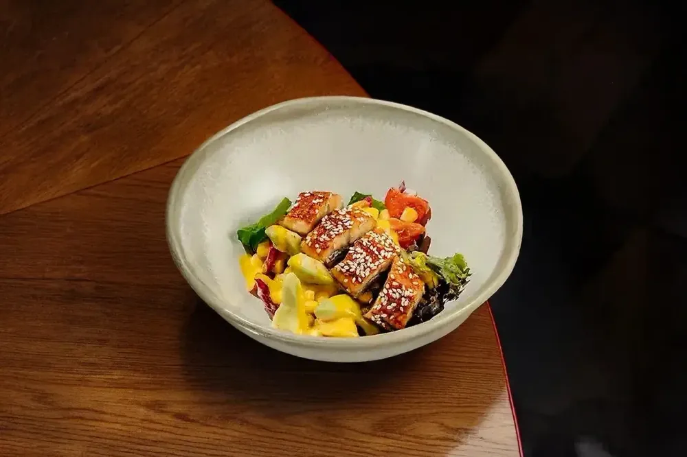 Угорь копченый в соусе унаги, манго свежий, перец болгарский запечённый, авокадо свежий, манговый соус (пюре из манго, масло растительное, яйцо куриное), салатный микс (шпинат свежий, салат лолла россо и радичио свежие), лук репчатый маринованный (лук репчатый свежий, свекла, сахар, соль)