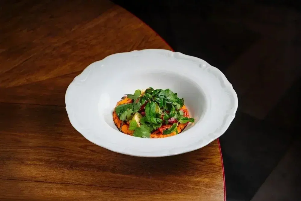 Томаты, авокадо, масло оливковое, уксус бальзамический, соль, кунжут кимчи, базилик, кинза, мята, мусс из печеных перцев.