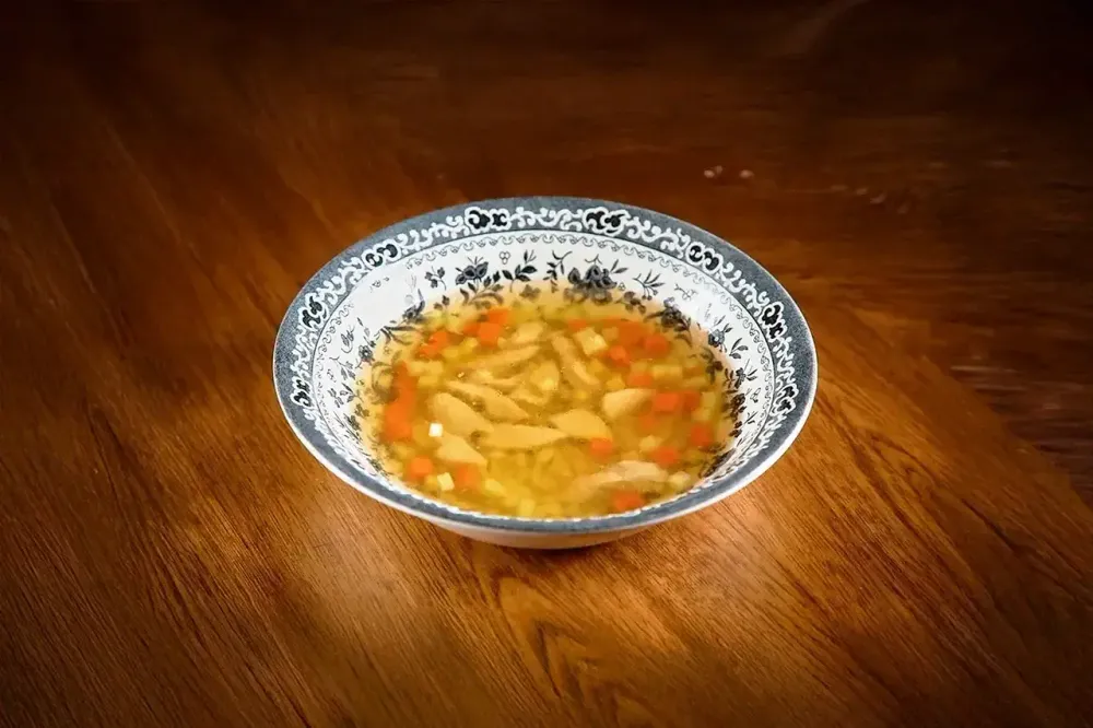 Бульон куриный (вода питьевая, куриное филе, лук репчатый, морковь, соль, специи), морковь отварная, капуста цветная отварная, кабачки отварные, орзо отварной