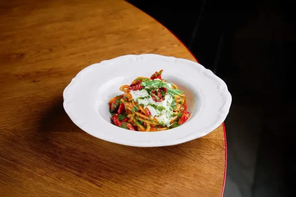Паста (мука семола, яйцо куриное, мука пшеничная, масло оливковое, соль), соус Наполи (томаты, лук репчатый, сельдерей стебель, чеснок, масло базилик (масло оливковое, базилик), соль, страчателла, томаты черри подвяленные (томаты черри свежие, масло оливковое, соль), пармезан, масло сливочное, соус Песто (масло оливковое, масло растительное, базилик свежий, орех кедровый, соль, чеснок, специи), паста чесночная (чеснок свежий, масло оливковое, соль), тимьян свежий