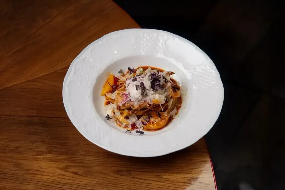 Паста (мука семола, яйцо куриное, мука пшеничная, масло оливковое, соль), утка окорок обжаренный, апельсин свежий, соус демиглас, соус хойсин, пармезан, томаты вяленые, пекорино, лук репчатый маринованный (лук репчатый, свекла свежая, сахар), масло сливочное, лук шалот свежий, масло оливковое, базилик свежий, петрушка свежая