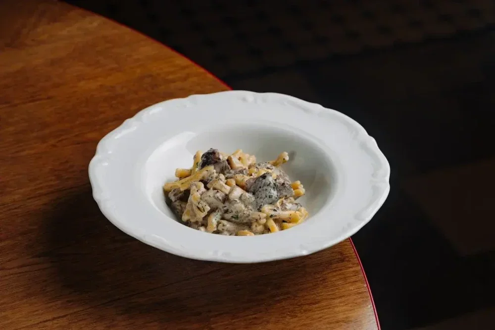 Тесто на пасту, грибы белые, паста трюфельная, сливки 22–35%, зелень свежая, лук шалот свежий, чеснок, говядина щека, сыр пармезан тёртый.