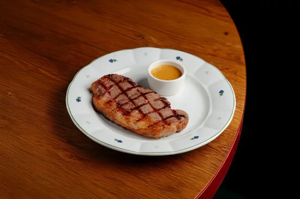 Стейк нрезается из отруба тонкий край, состоящего из единственной мышцы, по периметру стейка проходит тонкая полоска жира, перечный соус (лук шалот, перец дроблёный, демиглас, сливки, сливочное масло, пармезан, чеснок)