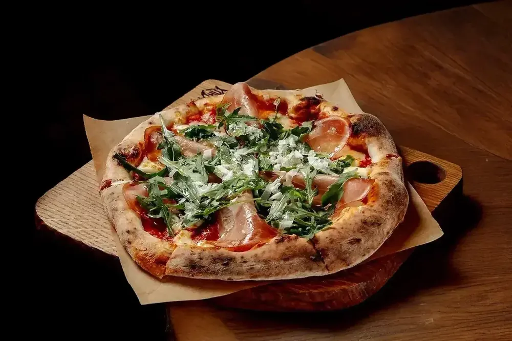 Тесто на пиццу (мука капуто, вода питьевая, соль, дрожжи, мука семола, мука пшеничная), соус томатный (томаты, масло оливковое, сахар, базилик свежий, орегано, соль), окорок свиной, сыр пармезан, салат рукола свежий, масло оливковое