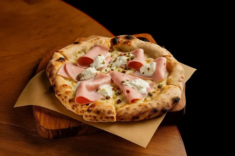 Тесто на пиццу (мука капуто, вода питьевая, соль, дрожжи, мука семола, мука пшеничная), cливочный соус, моцарелла, мортаделла, страчателла, фисташки