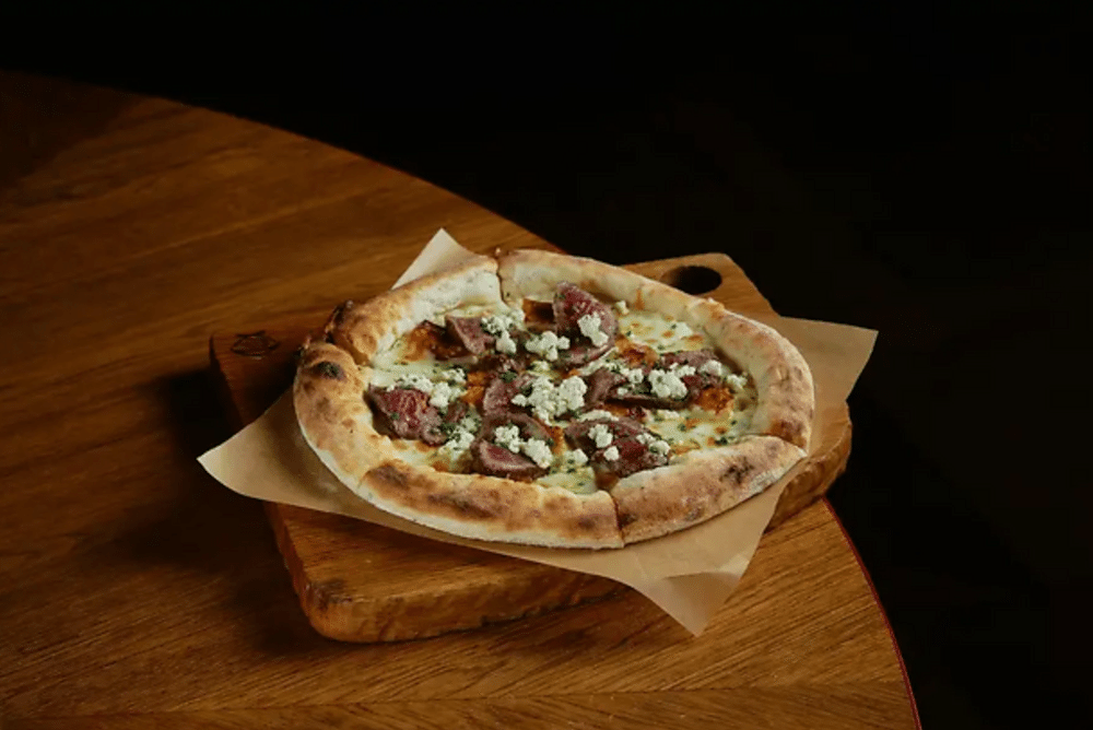 Тесто на пиццу (мука капуто, вода питьевая, соль, дрожжи, мука семола, мука пшеничная), моцарелла, татаки из говядины (вырезка говяжья, дрессинг на татаки (соус соевый, соус рисовый мирин, уксус рисовый, лук репчатый, чеснок, имбирь, масло растительное рафинированное), творог трюфельный (творог, масло растительное трюфельное), тыква запеченная, сливки 22%, лук-шнитт свежий
