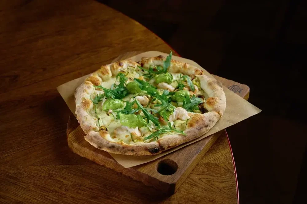 Тесто на пиццу, сливочная основа, моцарелла, креветки (чуть маринуются в оливковом масле с добавлением соли и чеснока), слайсы цуккини, мятый авокадо, рукола