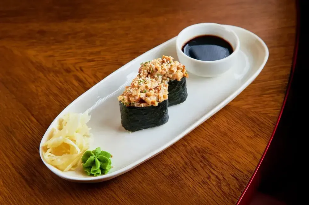 Рис для суши (рис отварной, уксус рисовый, сахар белый, соль, специи), угорь копченый, соус спайси (майонез, паста табаджан, соус табаско, соус кимчи, специи), водоросли комбу, имбирь маринованный, васаби