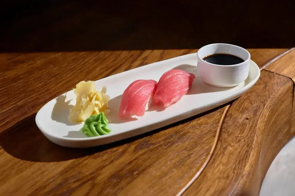 Рис для суши (рис отварной, уксус рисовый, сахар белый, соль, специи), тунец филе, имбирь маринованный, васаби