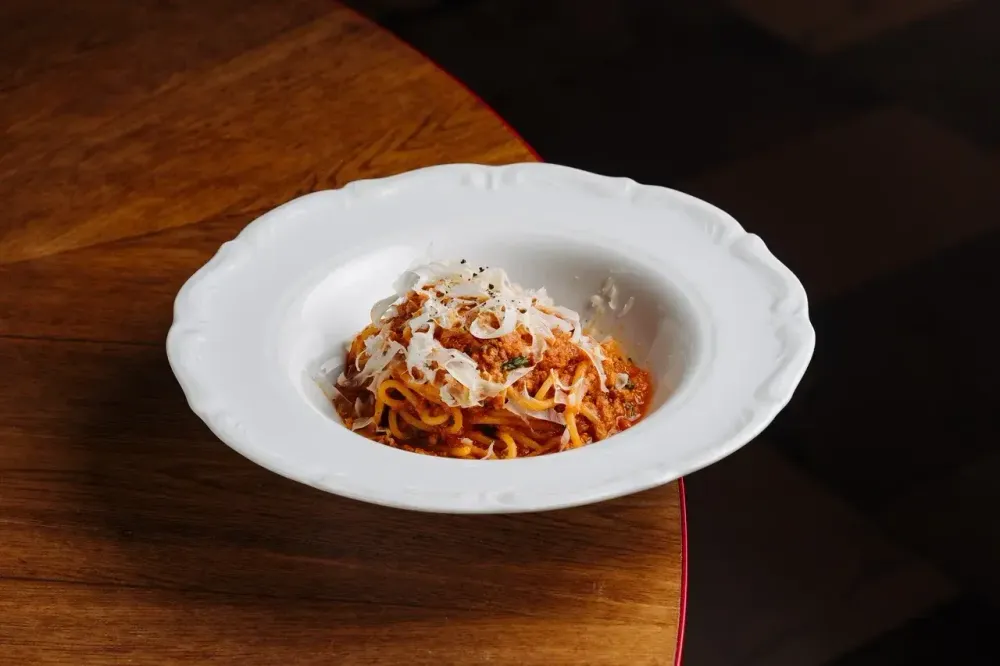 Болоньезе из растительного мяса (фарш растительный с белками сои и гороха, соус наполи, розмарин, лук, морковь, сельдерей, базилик, кинза), паста De Cecco, пармезан вегетарианский, оливковое масло, базилик