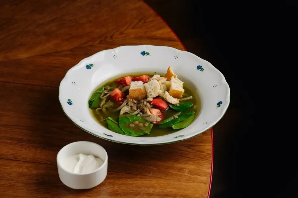 Суп готовится на основе грибного бульона(Шампиньоны, дегидрированные грибы, водоросли комбу, лук, чеснок, тимьян, петрушка) с добавлением чечевичной базы(чечевица, шпинат, зелень, мята, лук шаллот, чеснок, чили), внутрь добавляется отварная чечевица, вешенки, томаты, шпинат. Украшается суп гренками из домашнего хлеба, подается с вегетарианской сметаной.