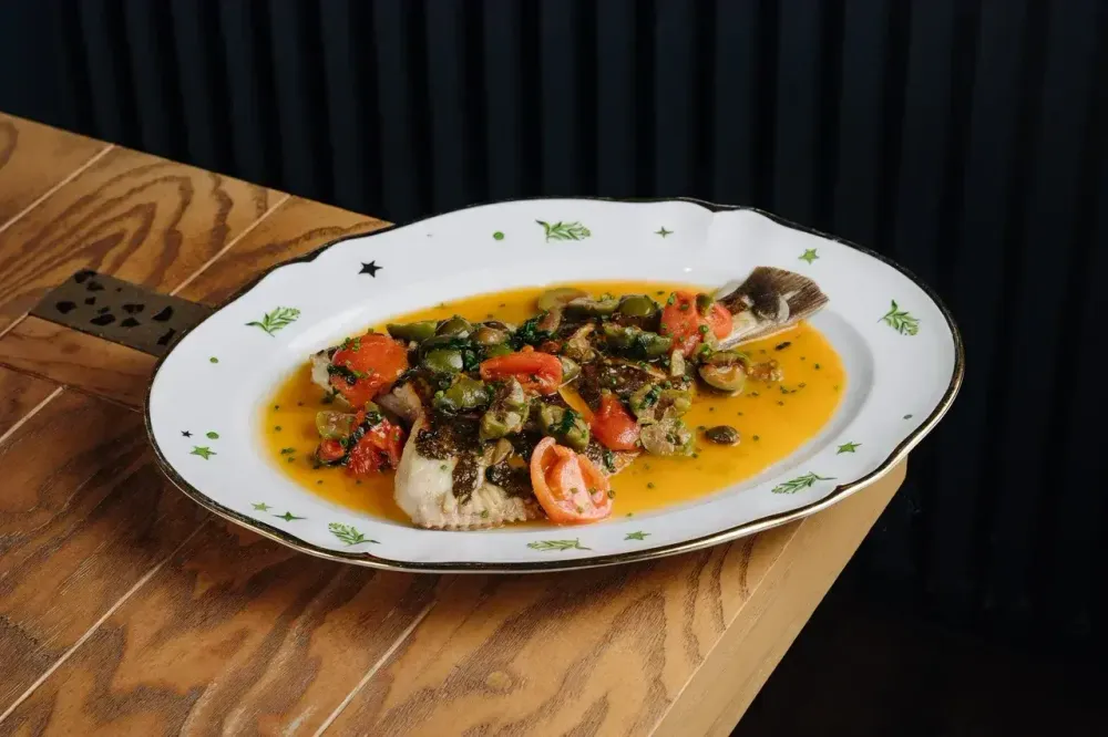 Камбала(без чешуи, головы) зачищается от плавников, солится, обжаривается на гриле до готовности. Гарнир: томаты черри конкассе, оливки тонде, каперсы, базилик, петрушка, белое вино, сливочное масло с печеным чесноком.