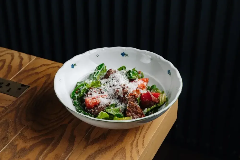 Ромейн, Шпинат, руккола, томаты. Куриная печень обваливается в небольшом количестве муки, обжаривается на растительном масле с последующим добавлением красного лука, красного вина и сахара. Подготавливаются чипсы из бекона и все вместе перемешивается в салате, заправляя его соусом на основе оливкового масла, бальзамического уксуса, горчицы, красного винного уксуса, печеного чеснока, меда и орегано. Украшается пармезаном.