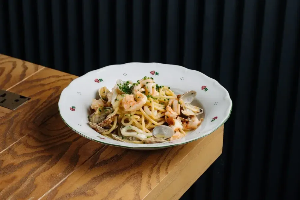 Домашняя паста, креветки, кальмар, вонголле, белое вино, масло сливочное с печеным чесноком, масло ким чи, специи, петрушка, соус понзу. Украшается цедрой лимона и луком шнитт.