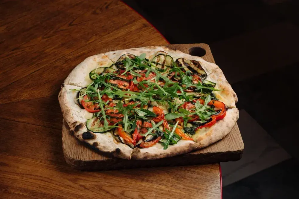 Тесто, печеный баклажан, цуккини, болгарский перец, томаты, руккола и вегетарианский песто (базилик, чеснок, масло растительное, оливковое, соль, специи, орех кедровый, вегетарианский пармезан)