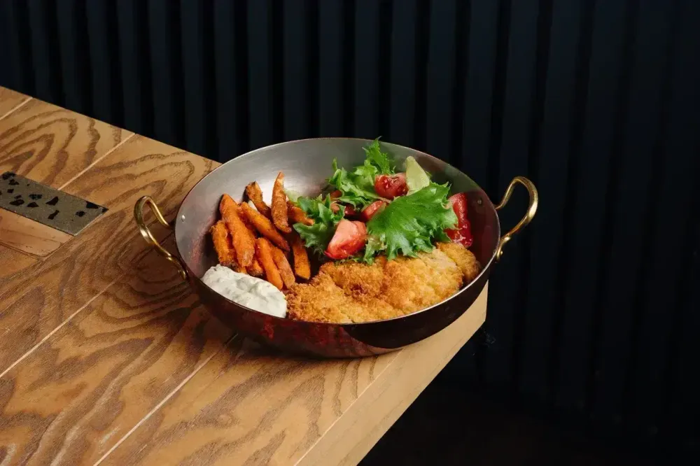 Куриное бедро в панировке, батат фри, соус тартар (домашний майонез, огурцы маринованные, горчица, сок и цедра лимона, каперсы консервированные, тархун, лук шаллот, специи), салат фриллис, томаты