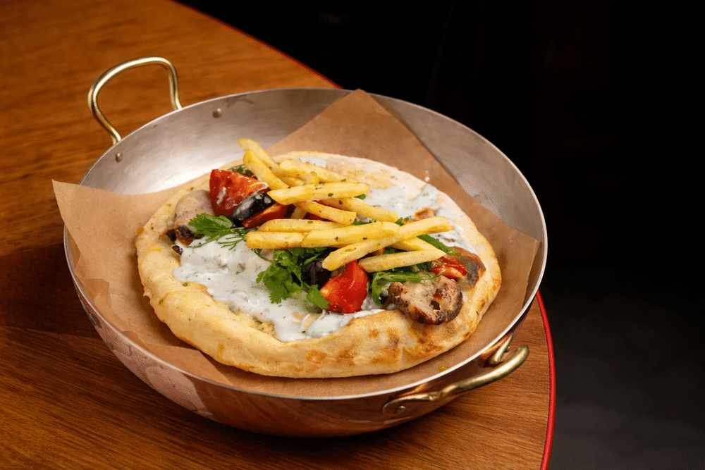 Домашняя пита (мука, йогурт греческий, сыр фета, масло оливковое, соль, сахар, дрожжи, уксус столовый), йогуртовый соус (йогурт греческий, кефир, соль, специи, кинза, укроп, чеснок), куриное бедро, свежие томаты, картофель фри, кинза, петрушка, оливки Каламата, кунжут кимчи
