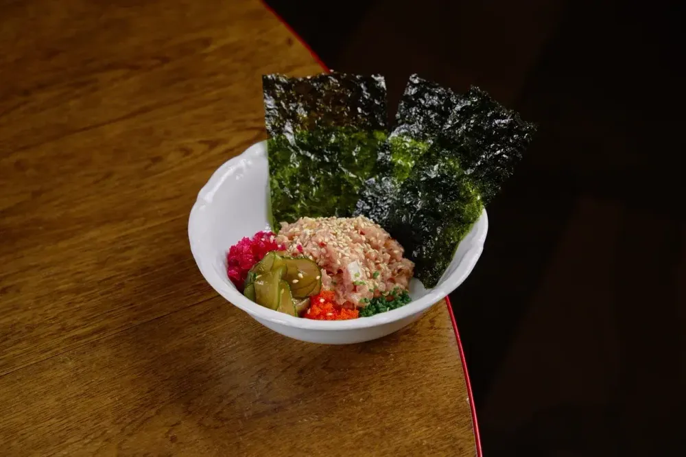 Тунец свежий, острый соус (майонез домашний, паста табаджан, соус рисовый, масло кунжутное, соус соевый), лук шнитт, битые огурцы (огурец свежий, маринад), икра тобико, лук репчатный маринованный, водоросли нори и кунжут
