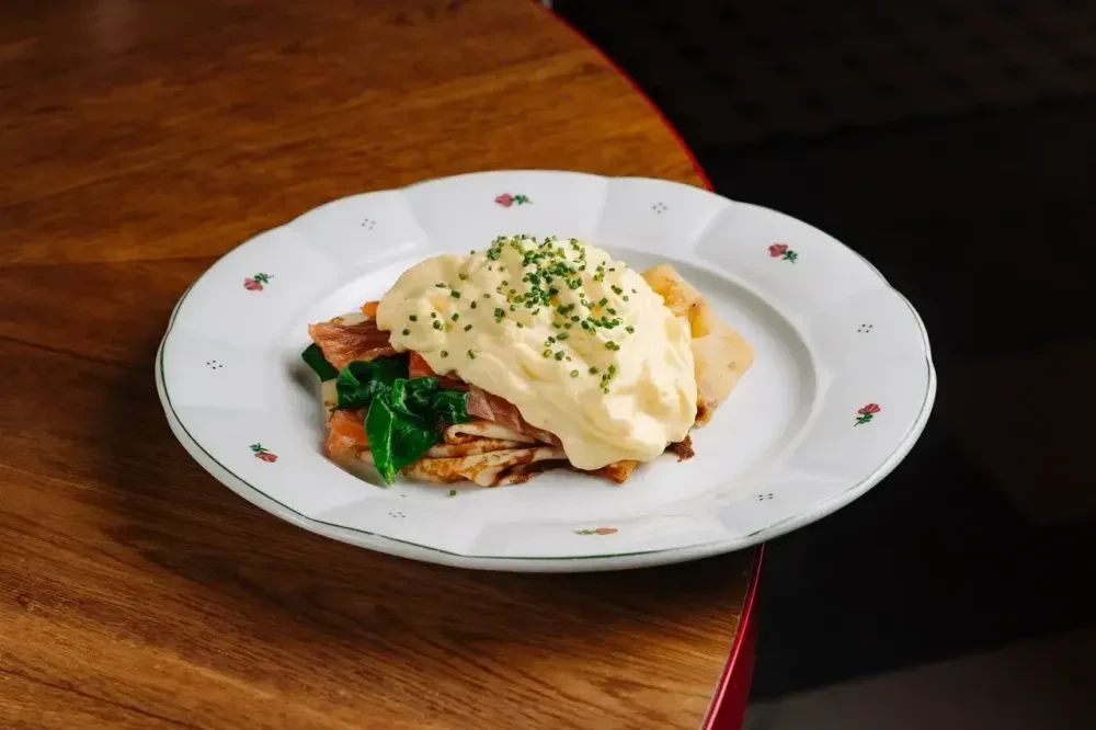 Блины 2 шт, лосось слабой соли, шпинат припущенный, яйцо пашот, соус голландский (масло сливочное, желтки, сок лимона) соль, перец.