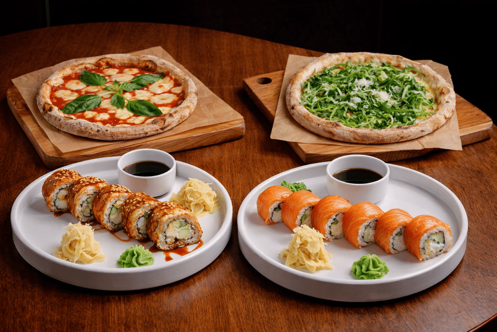 Состав набора: пицца маргарита, пицца четыре сыра, филадельфия классическая, филадельфия с угрем