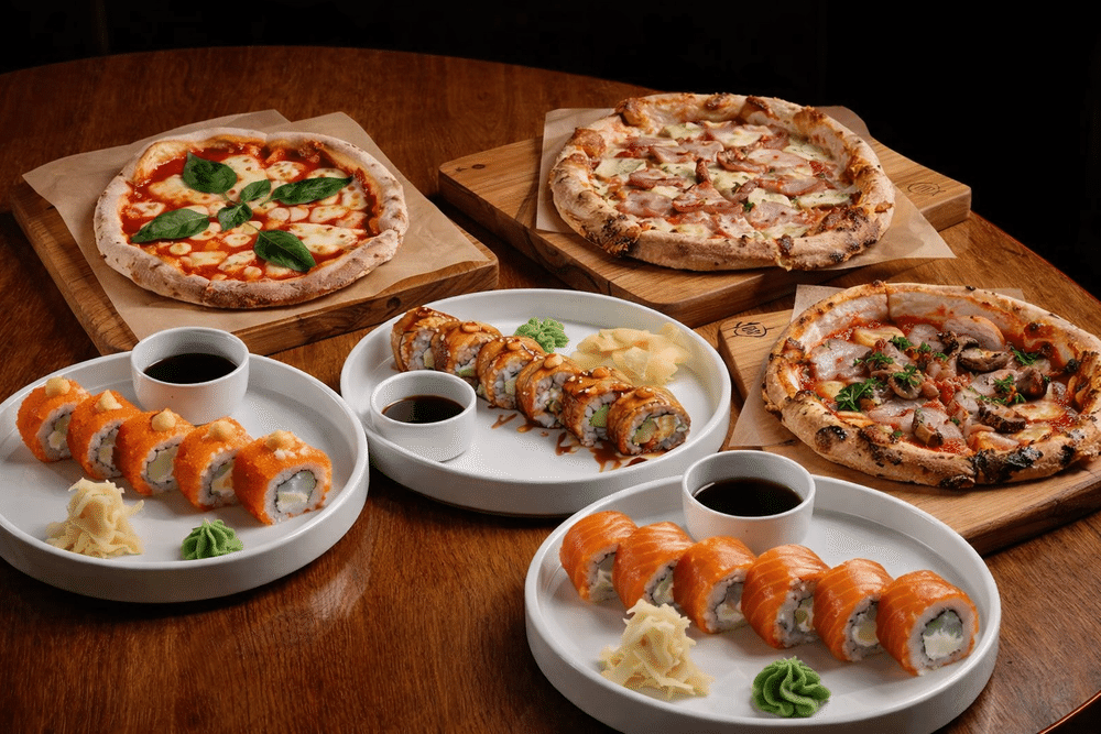 Состав набора: пицца маргарита, пицца ветчина и грибы, пицца с маскарпоне и беконом, филадельфия классическая, филадельфия с угрем, калифорния с лососем