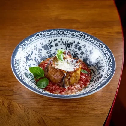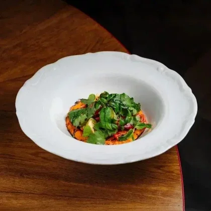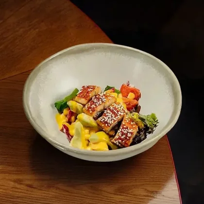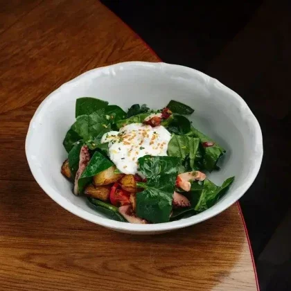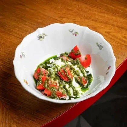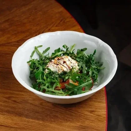 Томаты свежие, огурцы свежие, перец болгарский, сухарики пшеничные, сыр рикотта, заправка (уксус винный, масло оливковое, соус рыбный, сахарная пудра), салатный микс (шпинат свежий, салат лолла россо и радичио свежие), оливки каламата консервированные, соус песто (масло оливковое, масло растительное, базилик свежий, орех кедровый, соль, чеснок, специи), лук репчатый маринованный (лук репчатый свежий, свекла, сахар), соль, базилик свежий, микрогрин свежий