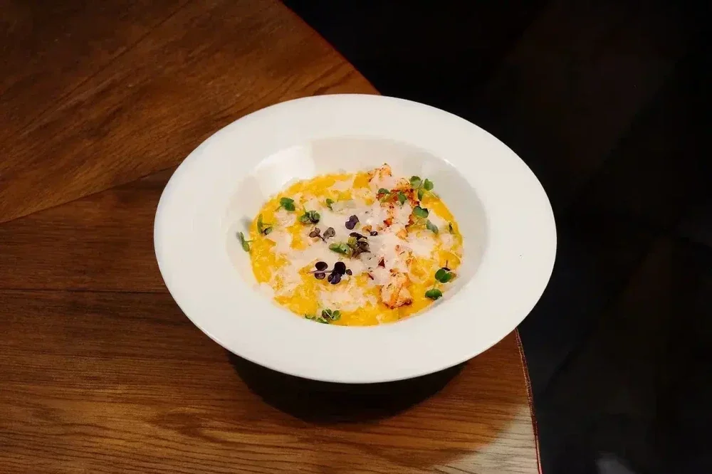 Рис карнароли, биск (креветки бульон, лук репчатый, морковь, паста томатная, масло растительное, коньяк, чеснок, апельсин, соль), крем из тыквы (тыква отварная, соль), масло сливочное, вино белое, лук шалот), креветки отварные, сыр пармезан, масло оливковое, микрозелень, соль, специи