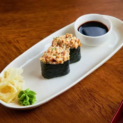 Рис для суши (рис отварной, уксус рисовый, сахар белый, соль, специи), тунец свежий, соус спайси (майонез, паста табаджан, соус табаско, соус кимчи, специи), водоросли комбу, имбирь маринованный, васаби хрен (2 шт.)