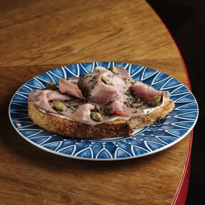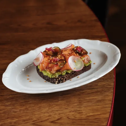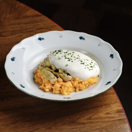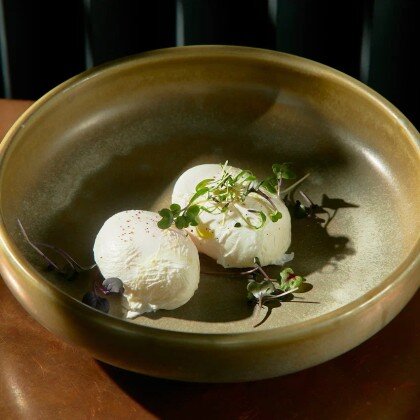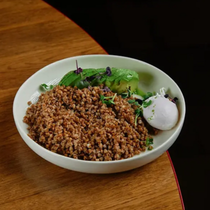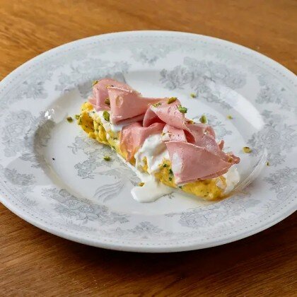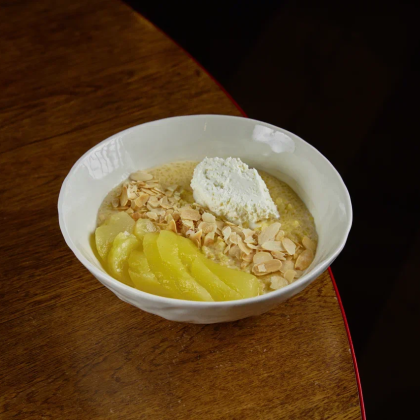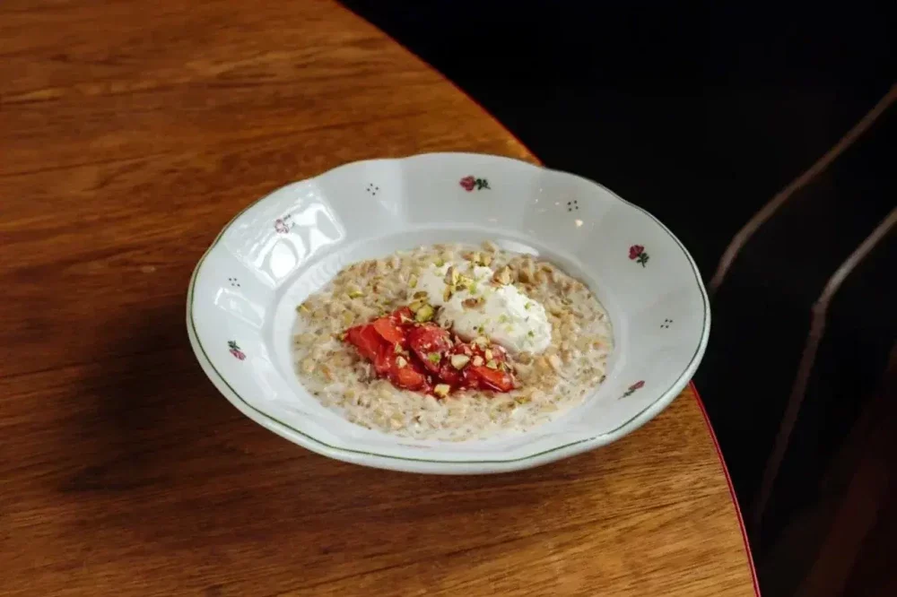 Классическая овсяная каша (овсяные хлопья, молоко, сливочное масло,соль), клубничное компоте (сахар, клубника, пектин), ганаш из белого шоколада (сливки 35%, белый шоколад, маскарпоне, сливочное масло), соленая фисташка.