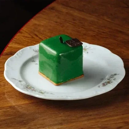 Корпусное пирожное. Шоколадное с малиной и розовым перцем. Корпус из белого шоколада. Шоколадный крем (темный шоколад, молоко, сливки, яйцо, желатин). Соус малиновый с добавлением розового перца (пюре из малины, малина, перец)